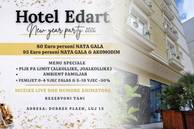 Festa e Vitit te Ri te hotel Edart Durres 80€, oferta per darken e vitit te ri 2026, nata gala, nata gala dhe akomodim, menu darka e vitit te ri, oferta per festat e fundvitit, rezervime dark familjare